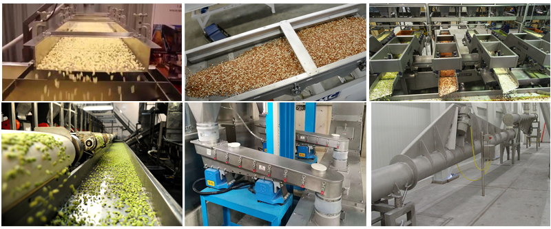 食品加工行业:谷物、糖、咖啡豆、坚果、蔬菜、水果等颗粒状或块状食品原料的输送和分配。